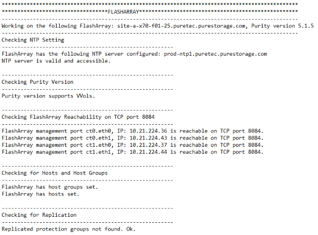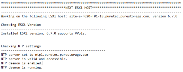 As the sharp system admin you are, you can probably take a quick glance at the requirements and know you’re good to go. But, it’s a great idea to double check a setting such as NTP that is usually “set it and forget it.” On a small cluster it’s easy enough to click around on a few hosts and vCenter and make sure it’s set and turned on but that’s no bueno on a much larger cluster. Sounds like a great task to be automated! With that in mind, I created the VVols Readiness Checker to quickly validate these prerequisites with PowerShell using PowerCLI and the Pure Storage SDK.