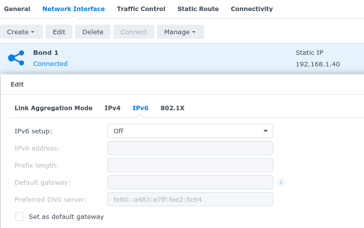 In DSM, I opened Control Panel and Network, turning off IPv6 setup on my network interface: